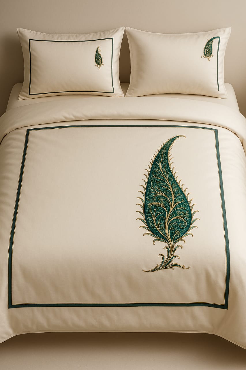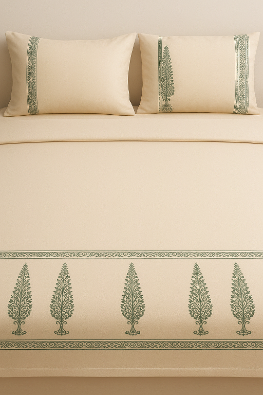 لحاف روتختی کتان یکنفره 3 تکه طرح پتینه سبز -کرم