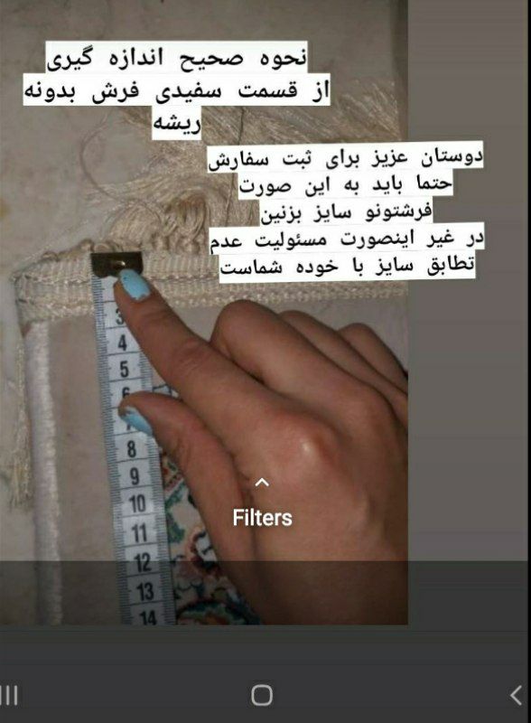 برای  سایز گیری فرشتون ریشه های فرش را داخل بزنید از قسمت چله سفید متر کنید طول و عرض فرش را دقیق و فیکس متر کنید و در سفارشتون اعلام کنی